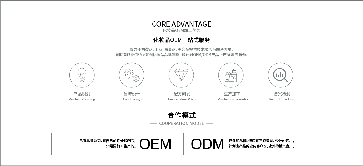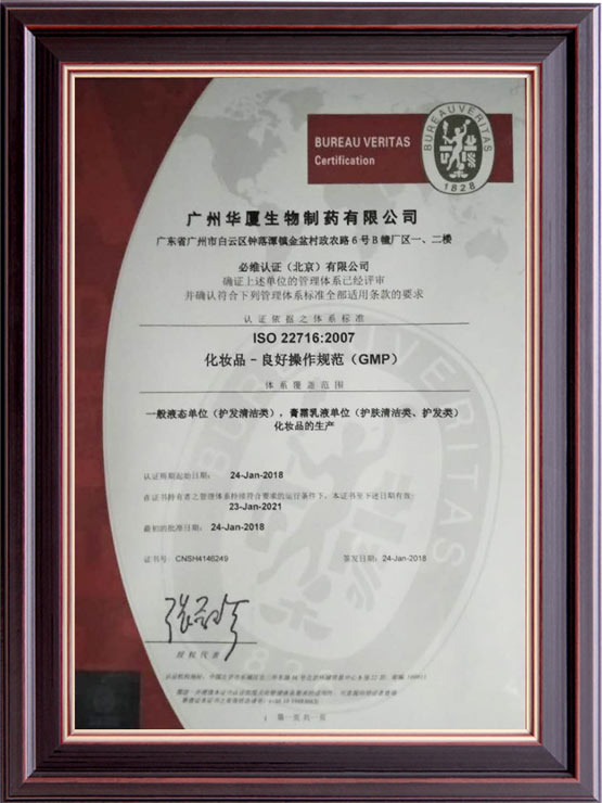 公司始創(chuàng)建于2012年,經(jīng)過八年的健康發(fā)展,已經(jīng)成為可以從事妝字號、消字號、械字號等系列產(chǎn)品生產(chǎn)加工的大型企業(yè)。企業(yè)坐落在美麗的廣州白云區(qū)鐘樓潭鎮(zhèn),擁有面積超過15,000平方米的生產(chǎn)廠房。廠房寬敞明亮,設(shè)計科學新進,擁有十萬級的生產(chǎn)車間,局部環(huán)境可以達到一萬級別;設(shè)備多采用新進的進口設(shè)備,自動化程度非常高,擁有一流的生產(chǎn)設(shè)施。工廠同時通過了ISO22716和GMCP質(zhì)量管理認證,擁有一流的質(zhì)量管理體系。廠